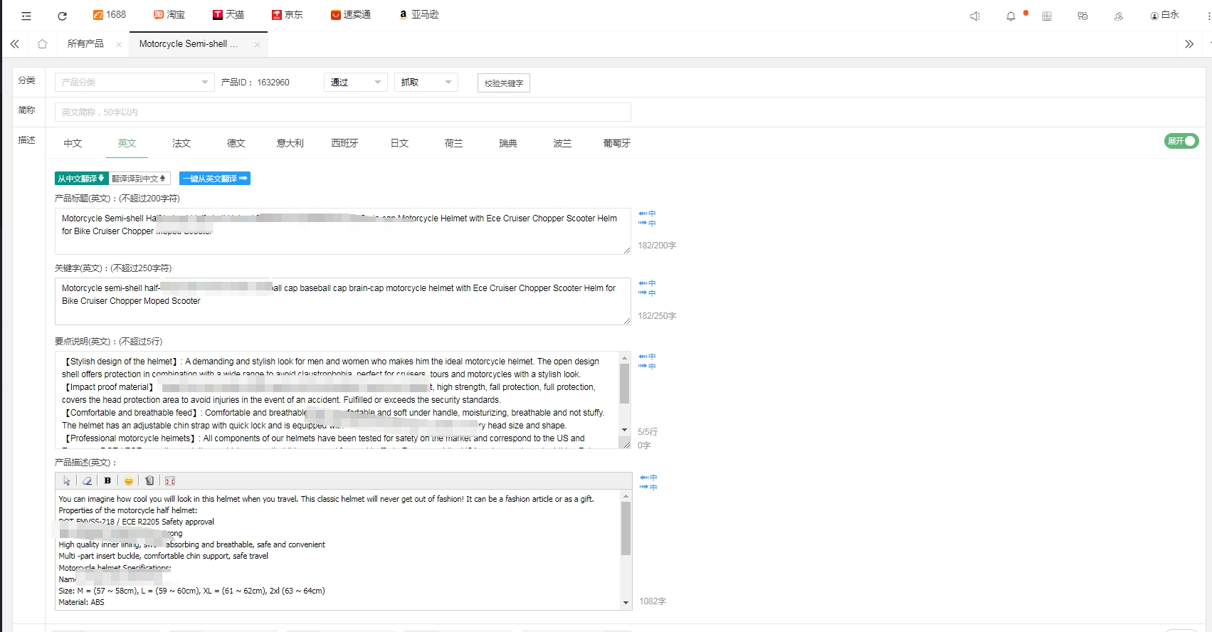 進(jìn)入產(chǎn)品詳情頁,進(jìn)行產(chǎn)品制作,包含標(biāo)題、關(guān)鍵詞、要素及詳情描述等,如下圖所示: